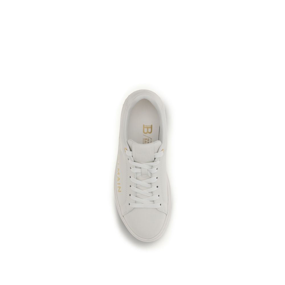 The B-Court Sneakers by Balmain combine sporty style with luxurious details. The lace-up closure with engraved eyelets ensures a secure fit, while the contrasting leather label with the Balmain Paris logo adds a distinctive touch. The leather heel counter with embossed PB logo and visible stitching accentuate the refined design. The thick rubber outsole with embossed Balmain logo offers comfort and stability. Leather lining and insole complete the look, making these sneakers perfect for those seeking a balance between elegance and practicality.