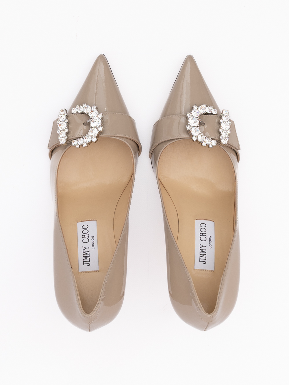 100% Authentic Jimmy Choo Taupe Grey Patent Leather Chery 85 Pumps
