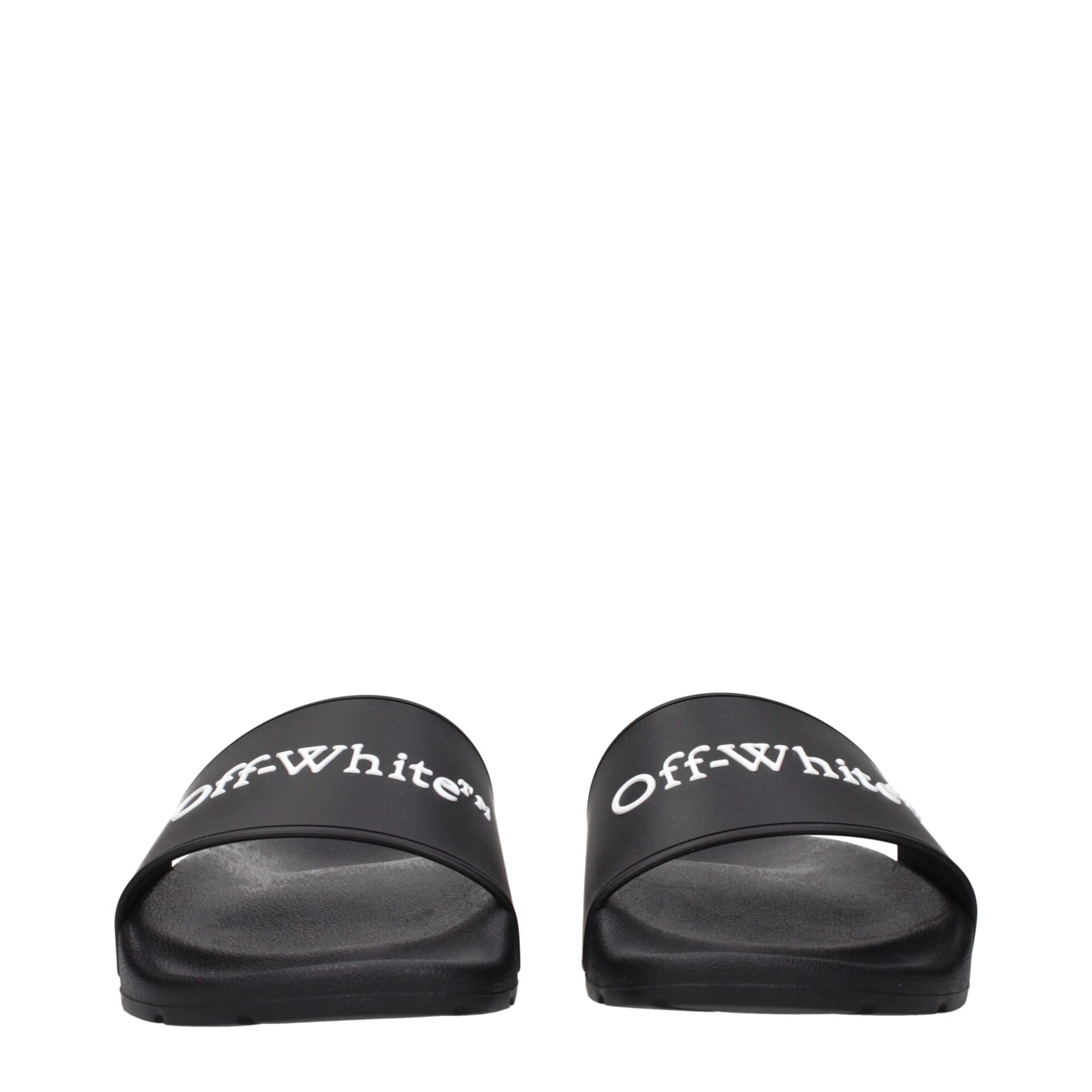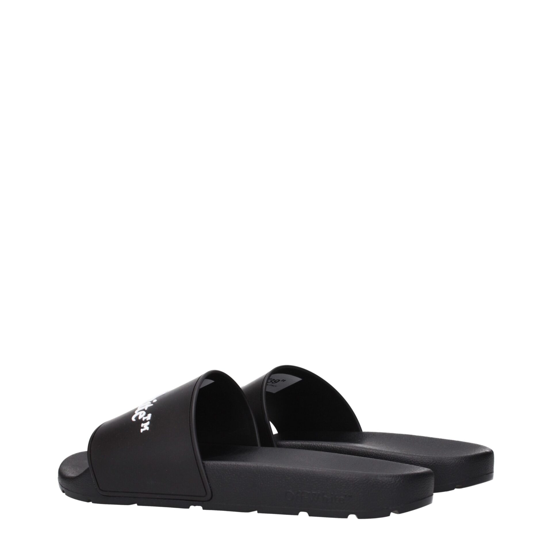 The product with MPN OMIU002MAT0011001 and code F84958 rubber in black is a slippers and clogs designed by Off-White. It has features like front logo.