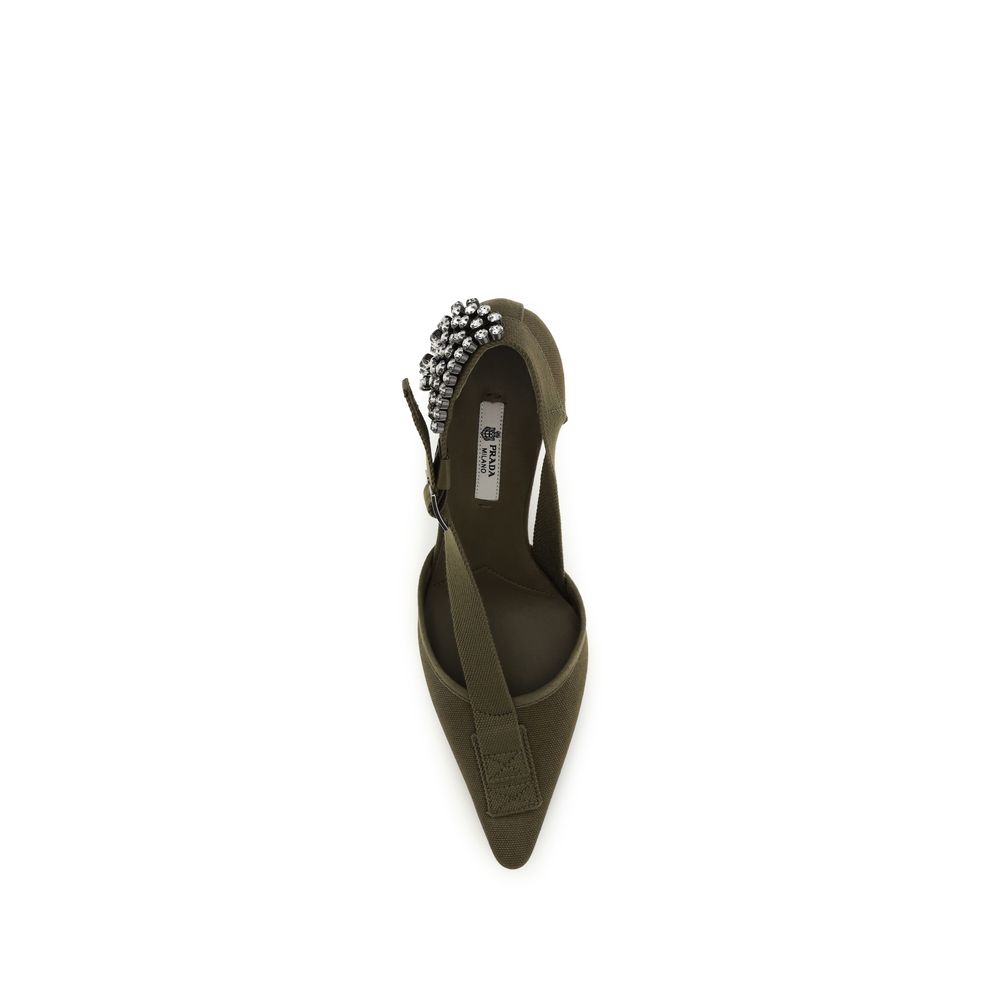 The canvas Pumps with crystals by Prada strike the perfect balance between sophistication and glamour. Inspired by the feminine silhouettes of the 1990s, they combine the casual texture of canvas with a sparkling cascade of crystals, creating a refined and original contrast. The geometric heel wrapped in fabric and the metal buckle with the logo complete the design, while the leather and rubber sole with lettering logo adds a distinctive touch of luxury.