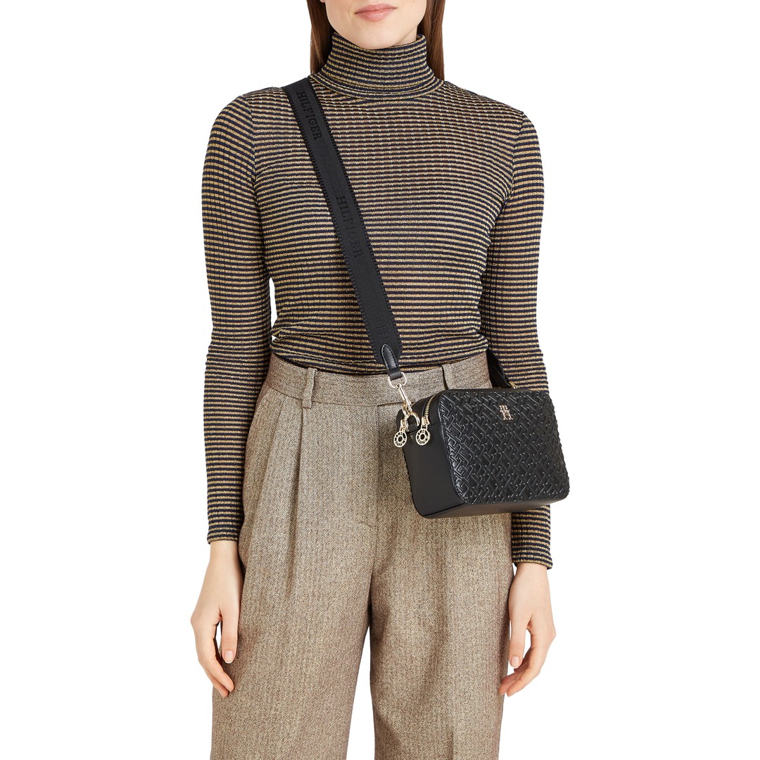 Elegantiška juodos spalvos rankinė su subtiliu reljefiniu raštu ir aukso spalvos detalėmis. Kompaktiškas, tačiau talpus modelis puikiai tiks kasdienai ar vakarui. Reguliuojamas dirželis leidžia nešioti per petį arba kryžmai, užtikrinant patogumą ir stilių. Užsegama užtrauktuku – saugiam jūsų daiktų laikymui.