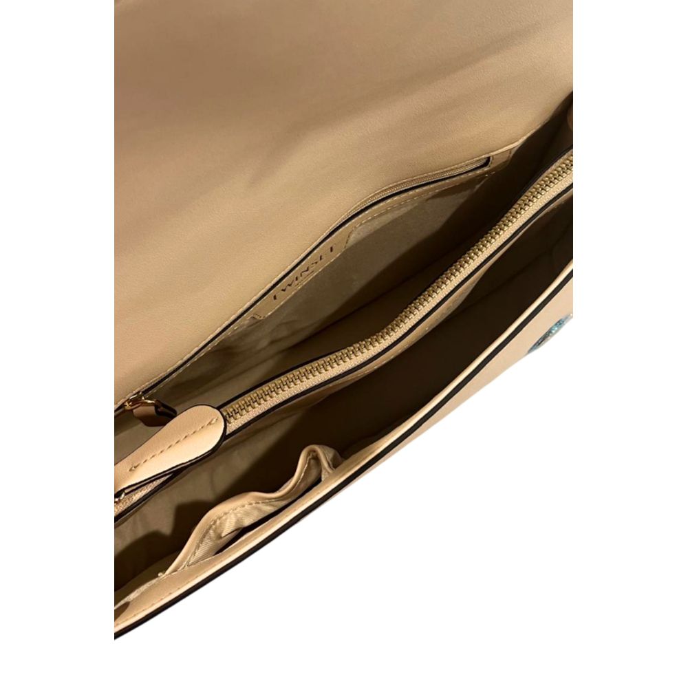 Embrace the epitome of contemporary sophistication with Twinset’s shoulder bag, an accessory that redefines modern elegance. This beige beauty boasts a seamless chain strap complemented by a magnetic-button flap closure that ensures your belongings stay secure in style. With its ample internal compartments, this bag is not only a fashion statement but a practical companion for any ensemble. The exquisite gold metallic details and the prominent front logo add a touch of luxe, making it a must-have for the fashion-forward maven.