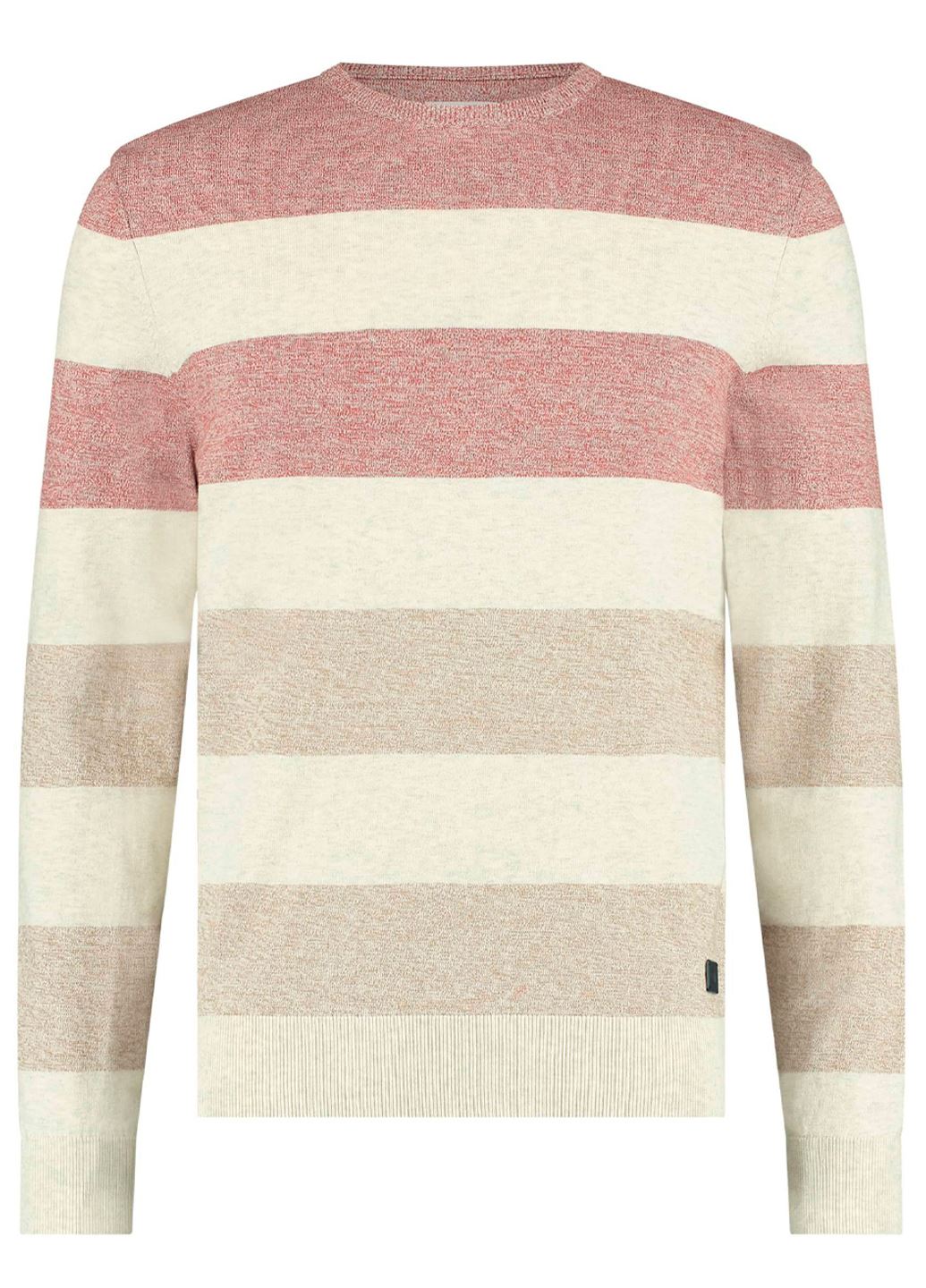 Šis megztinis sujungia šiuolaikišką dizainą ir natūralų komfortą. Kontrastingos horizontalios smėlinės ir raudonos spalvos juostos suteikia įvaizdžiui dinamiškumo, o smulkus mezgimas daro modelį vizualiai lengvą ir itin malonų dėvėti. Tai puikus pasirinkimas pavasariui ar rudeniui tiems, kurie vertina patogumą ir subtilų stilių.